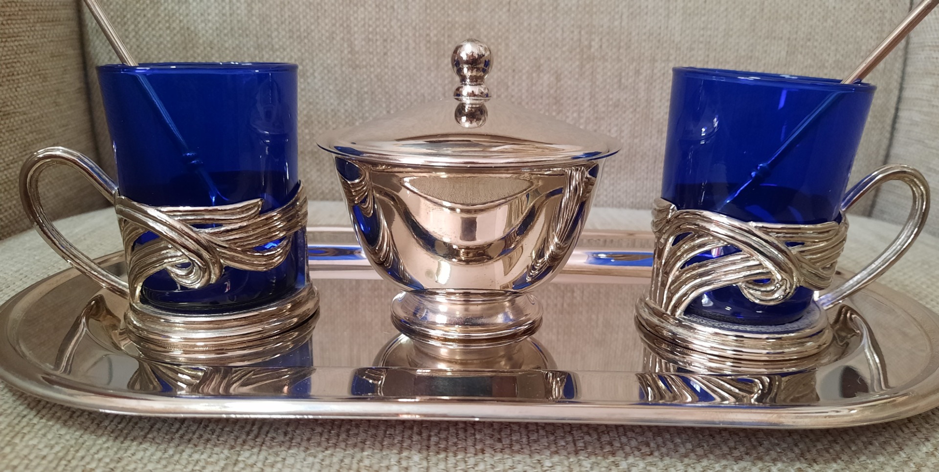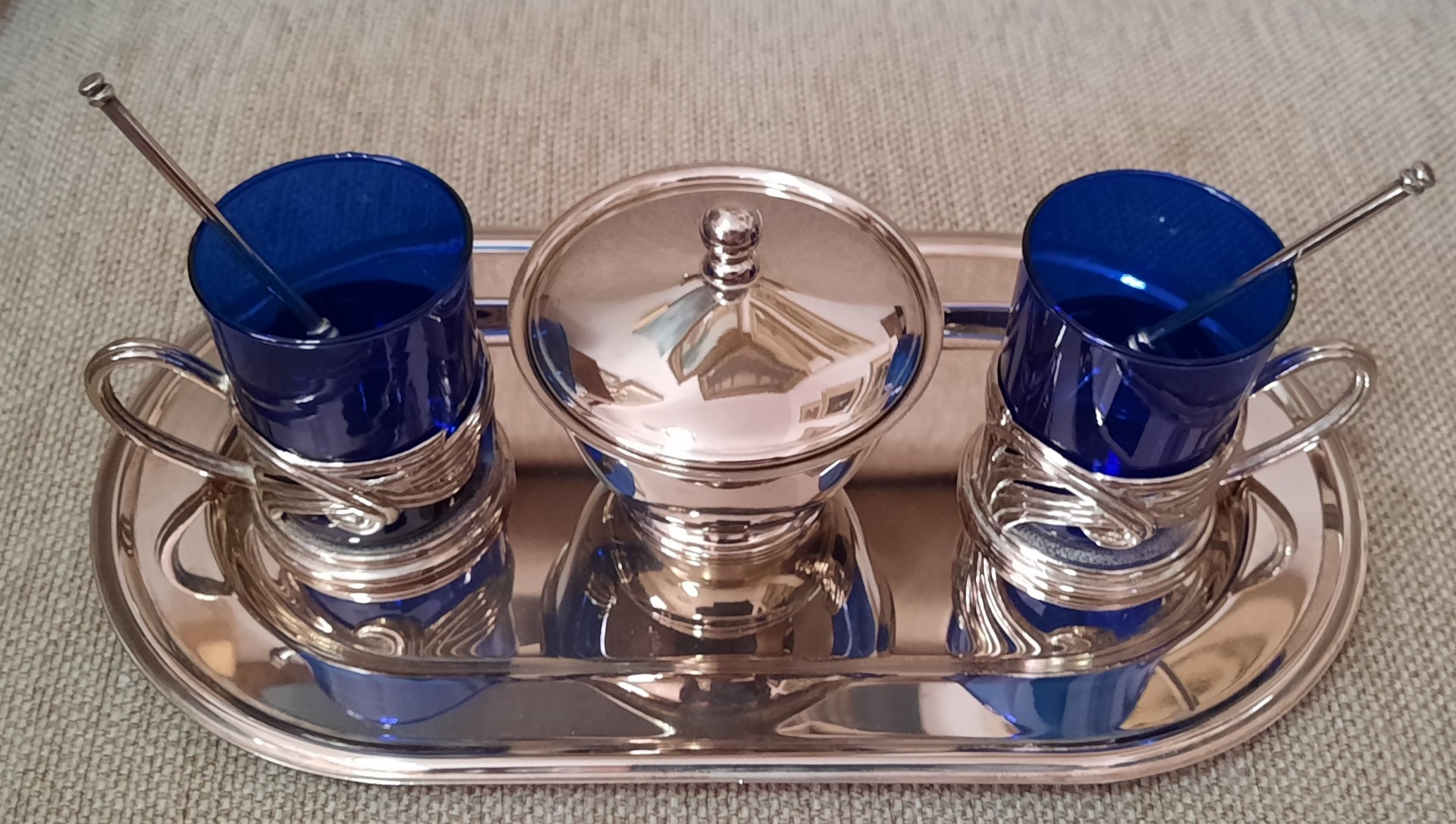 Mocca párová súprava z nerezu a s kobaltovým sklom, lyžičkami, s cukorničkou a podnosom