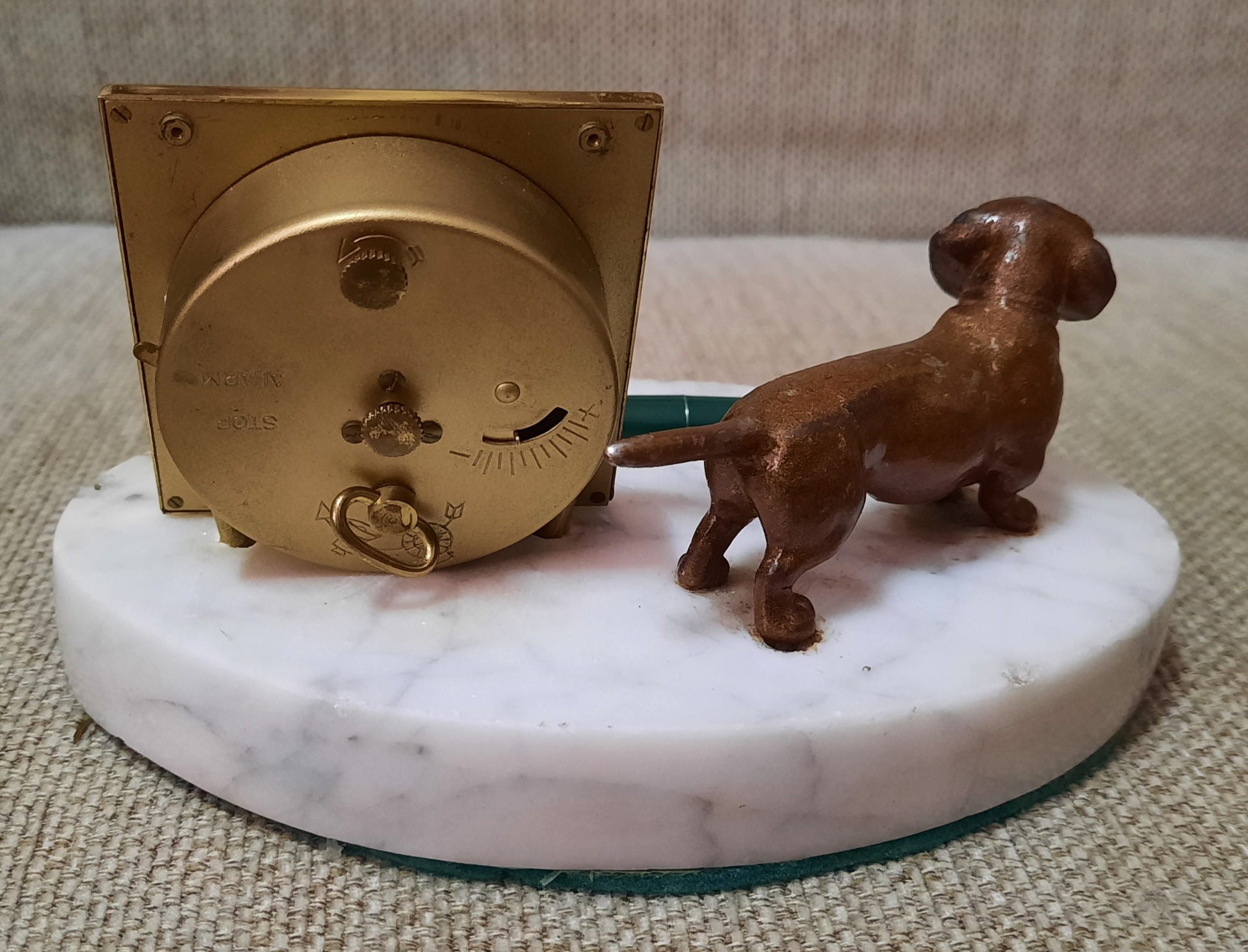 Mramorové hodiny Junghans, s bronzovým psom, Art Deco, roky cca 1930 - 1950