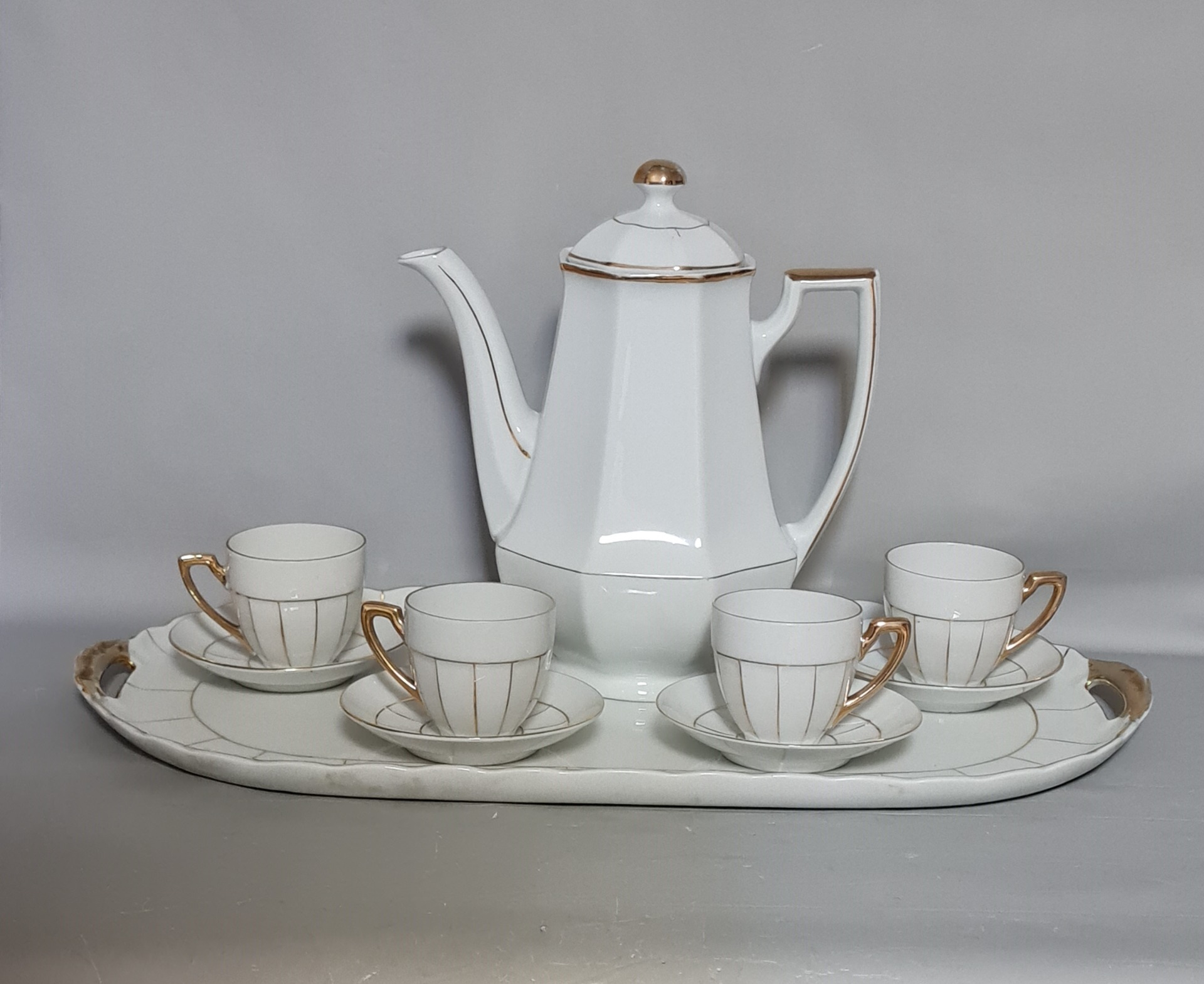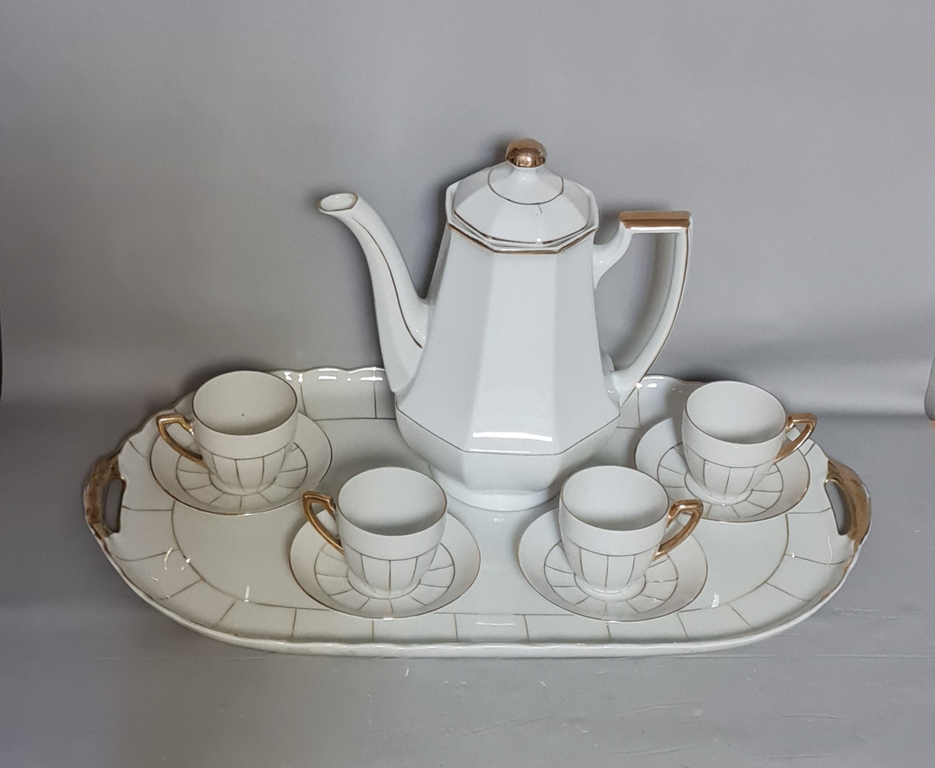 Porcelánová mocca súprava s podnosom VICTORIA, Art Deco, výborný stav. 1x konvica, 4x šálka 4x podšalka 1x podnos.