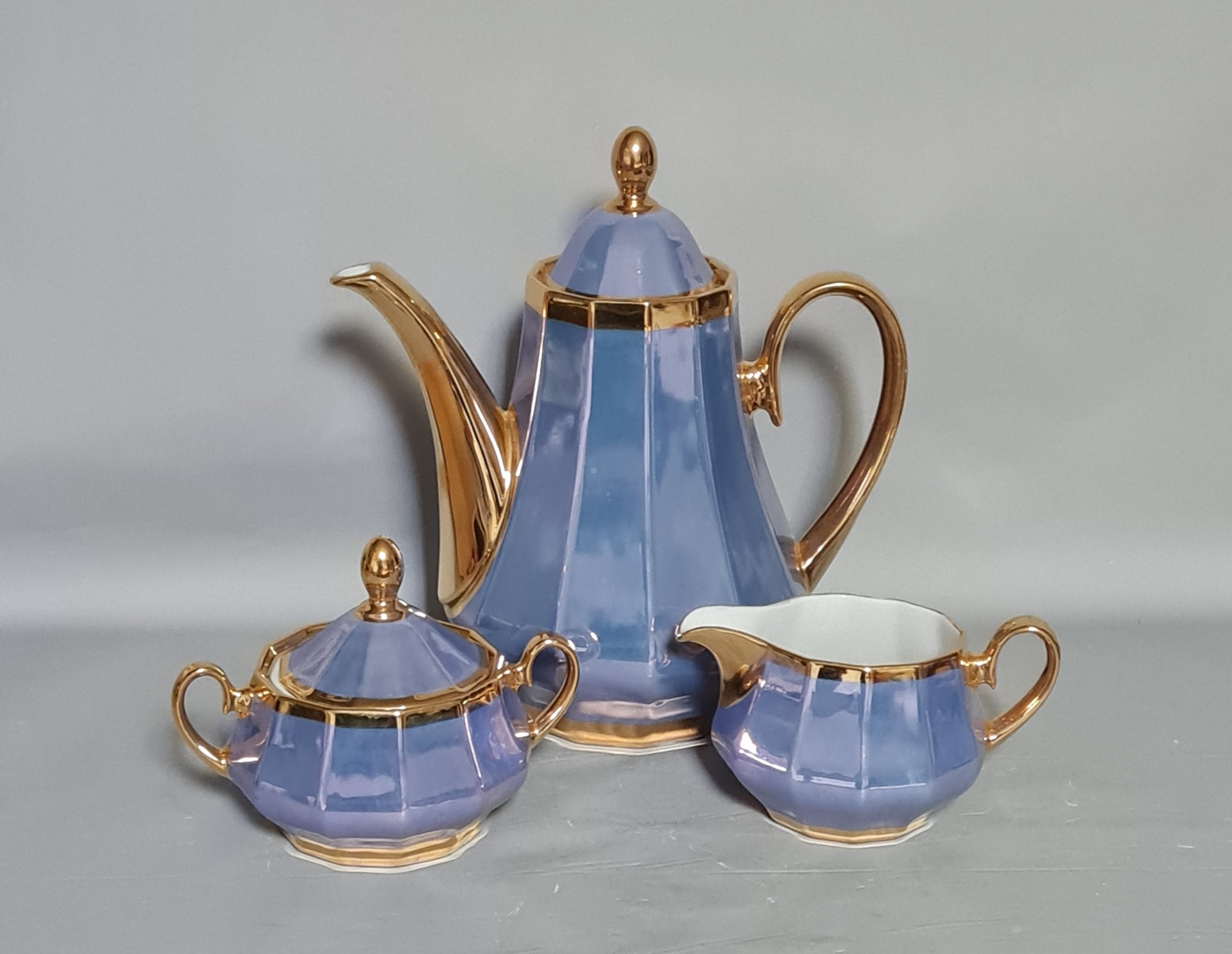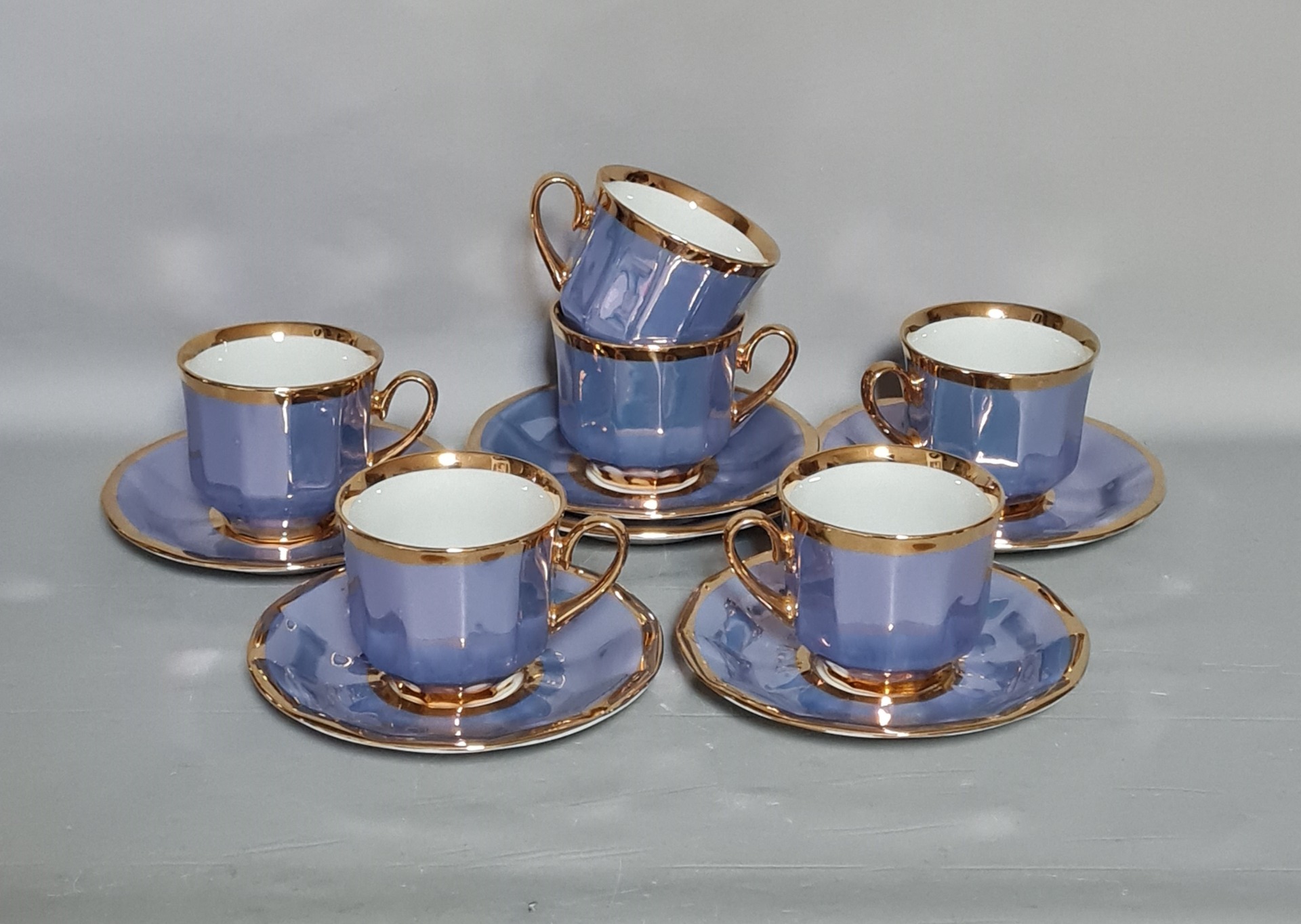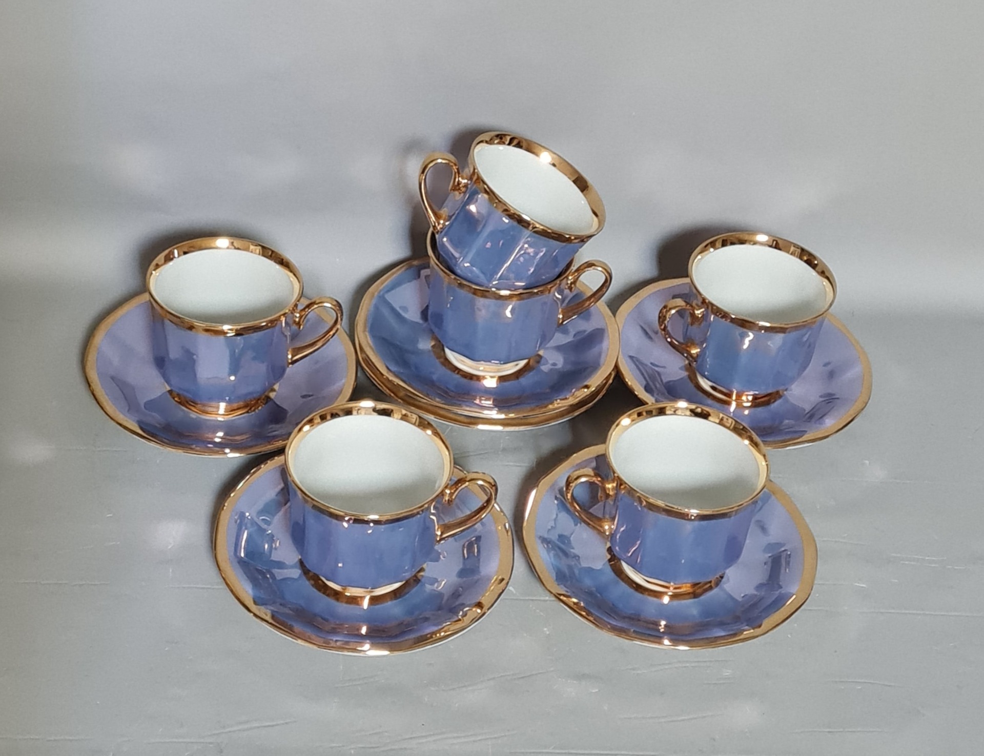 Ojedinelá kompletná retro mocca súprava, perleťovaná a pozlátená, výroba Valašská Belá, roka 1960 - 1970 ako nová, nepoužívaná, počet kusov 6 +6 +1 +1 + 1