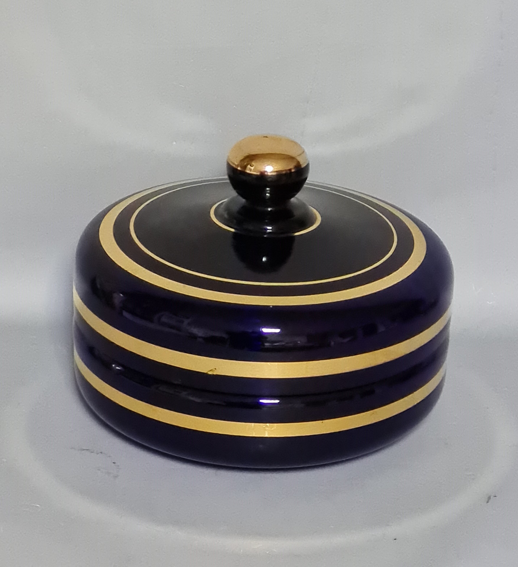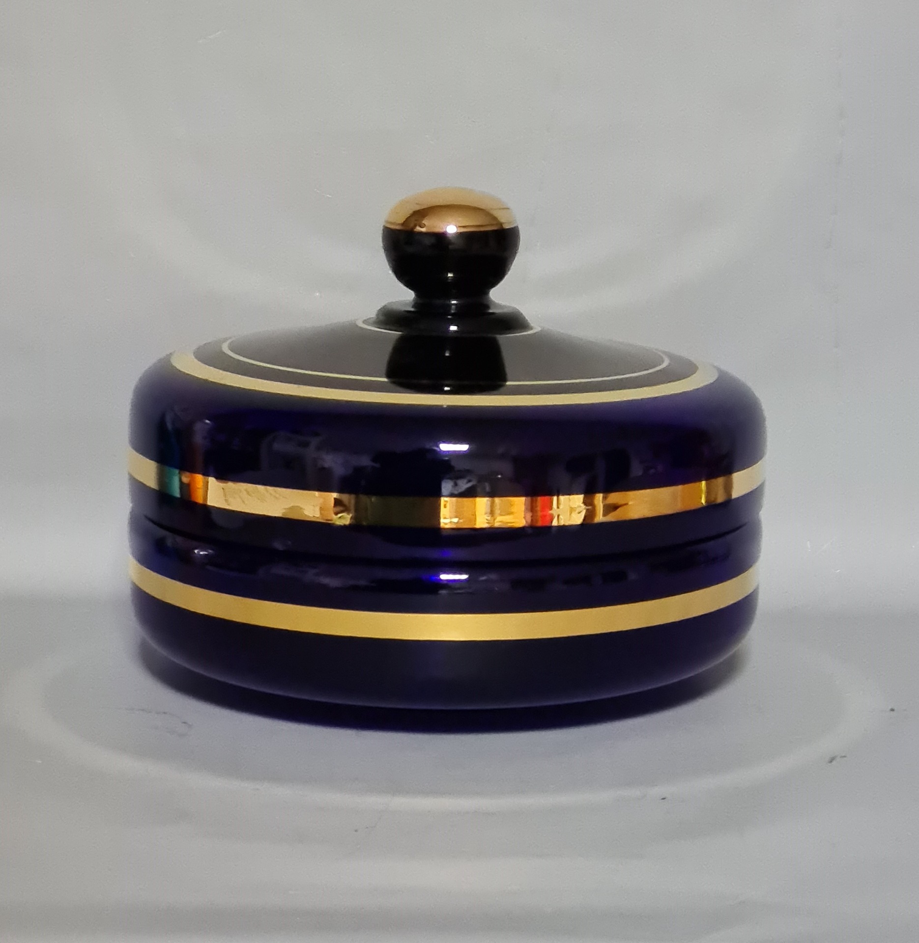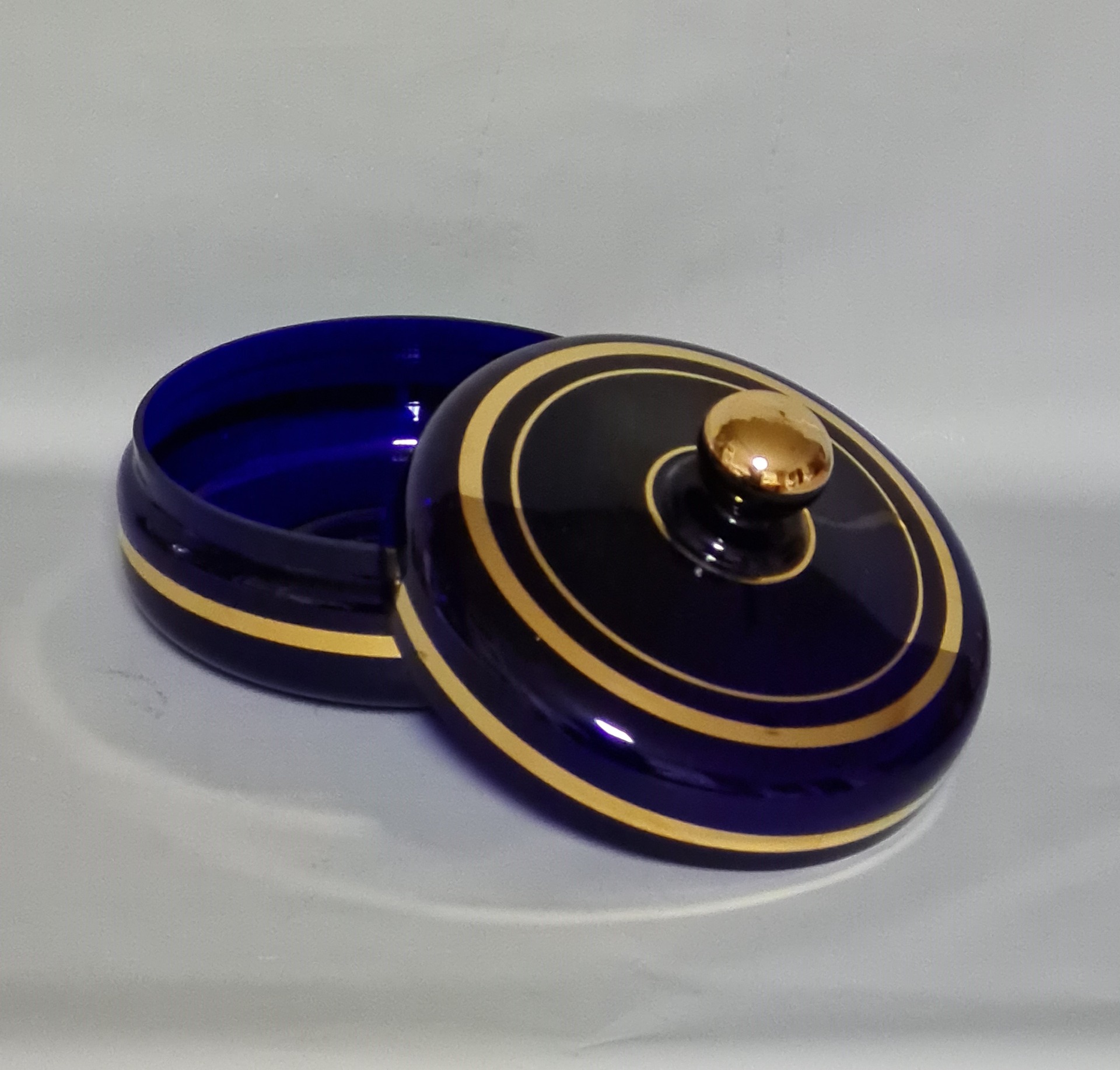 Sklenená dóza, kobaltové sklo, pozlátená, roky cca , 1955 - 1965